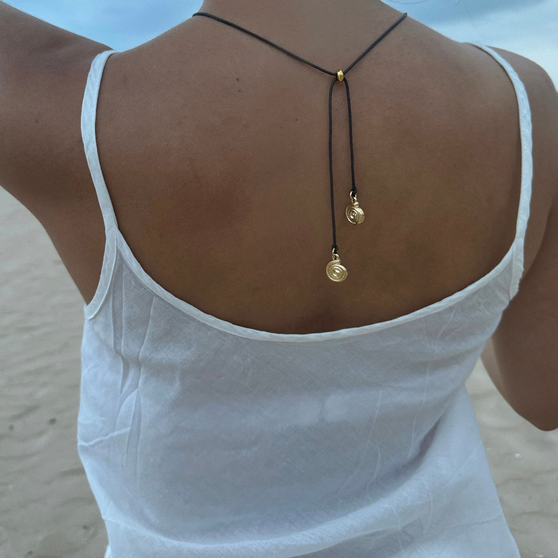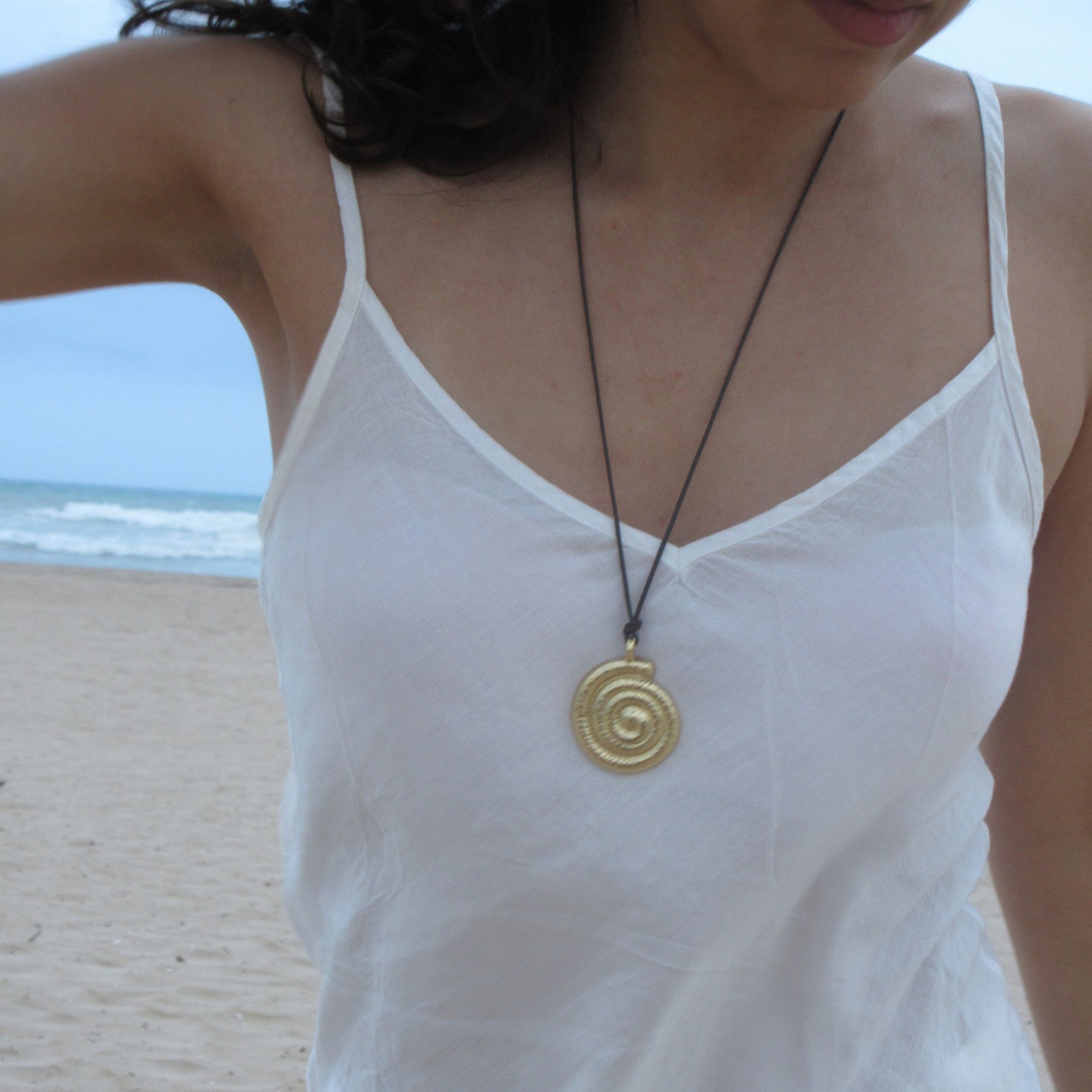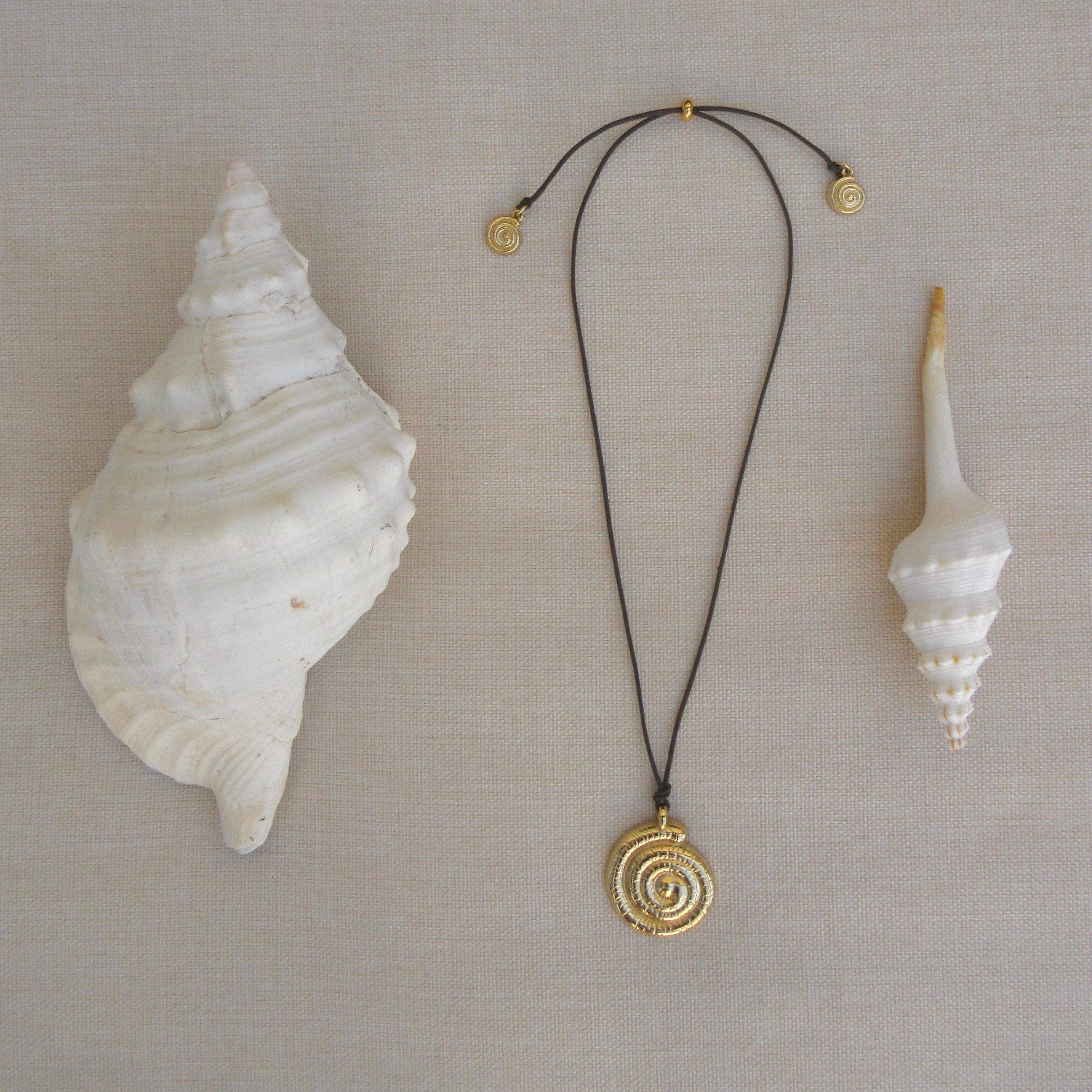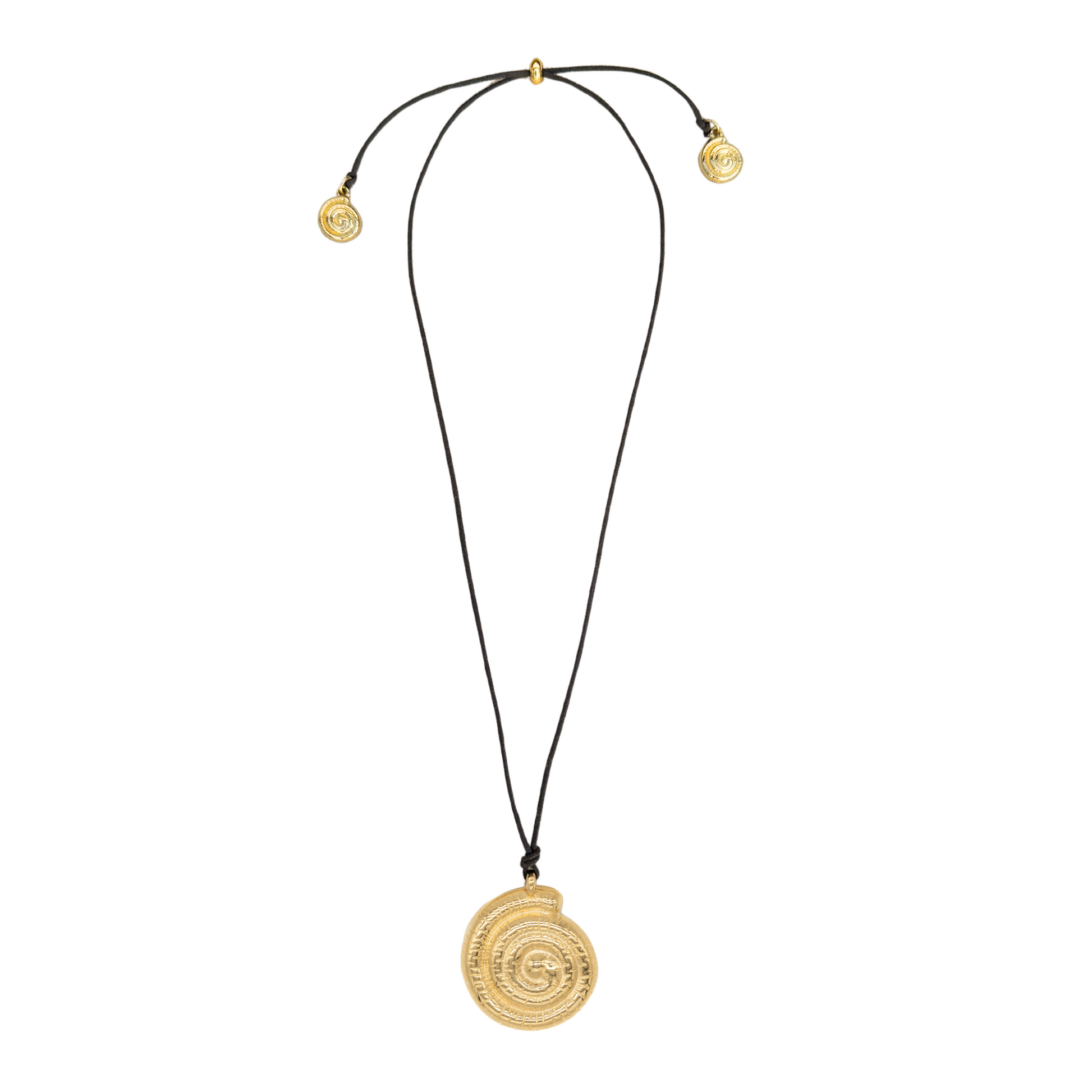 Caracola bañada en oro de 18 quilates y cordón de algodón en marrón oscuro.